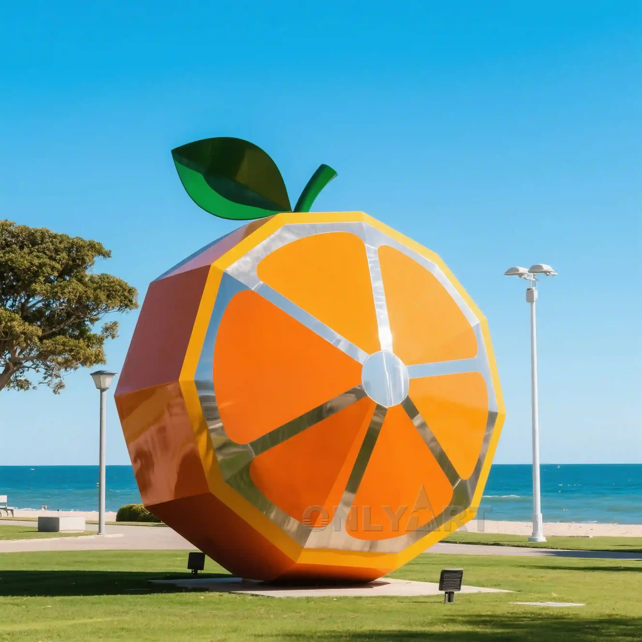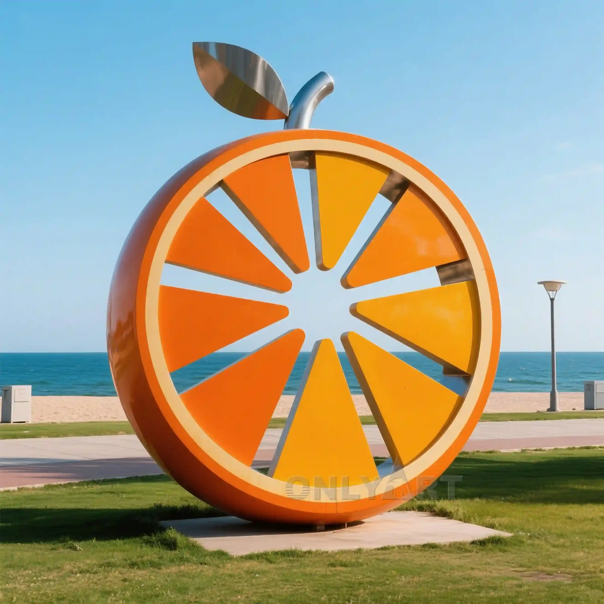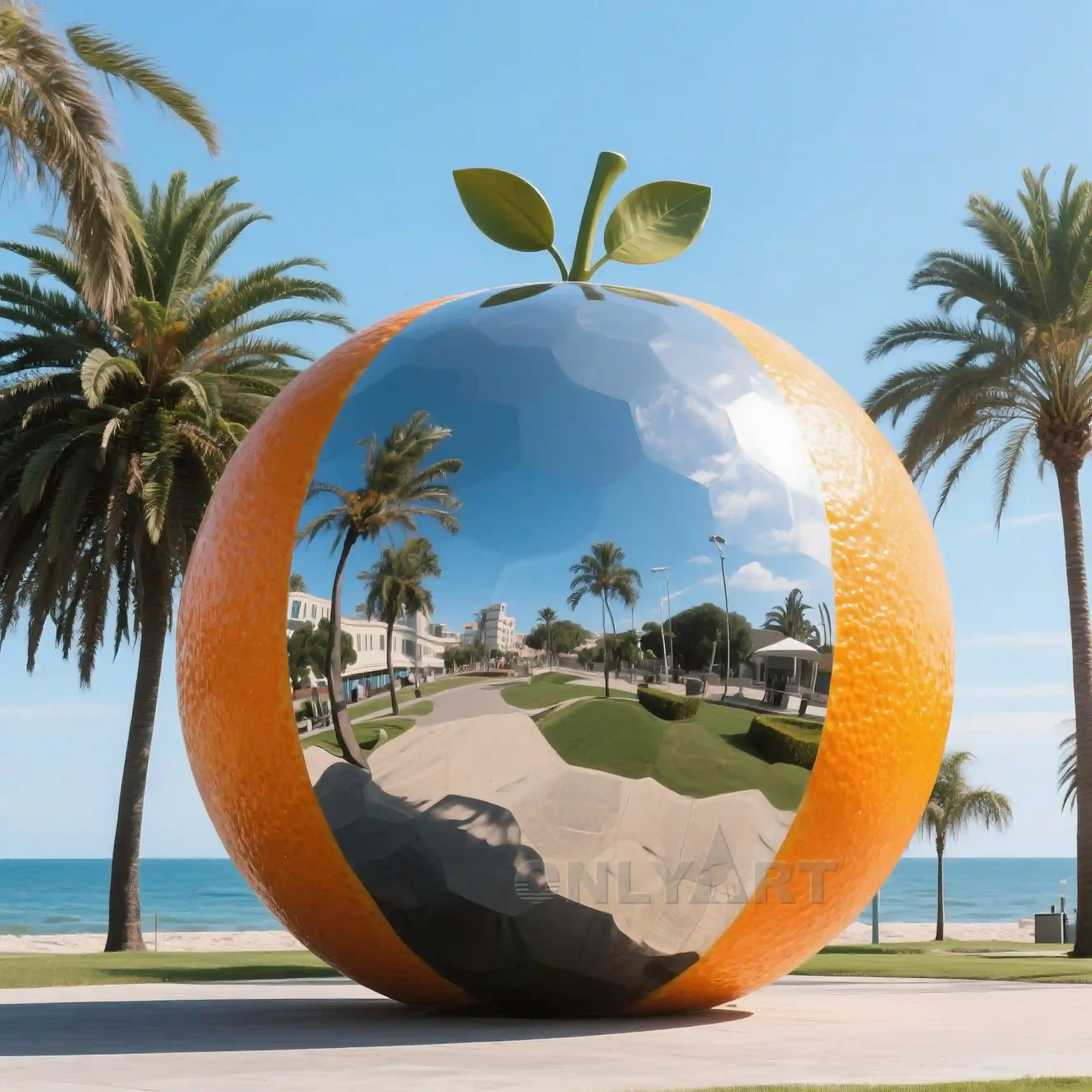 From the orange sculpture’s details, we can see that the orange’s belly is the original stainless steel, a mirror finish, after multiple polishing. The rest of the sculpture is painted a vibrant orange color, which is particularly beautiful. In the summer sun, it also adds a harmonious and gentle touch to the surrounding environment, creating a comfortable atmosphere. This large orange sculpture is the perfect decoration for this location. Of course, it can also be used in many other places, such as orchards, supermarkets, villas, and wholesale vegetable markets.