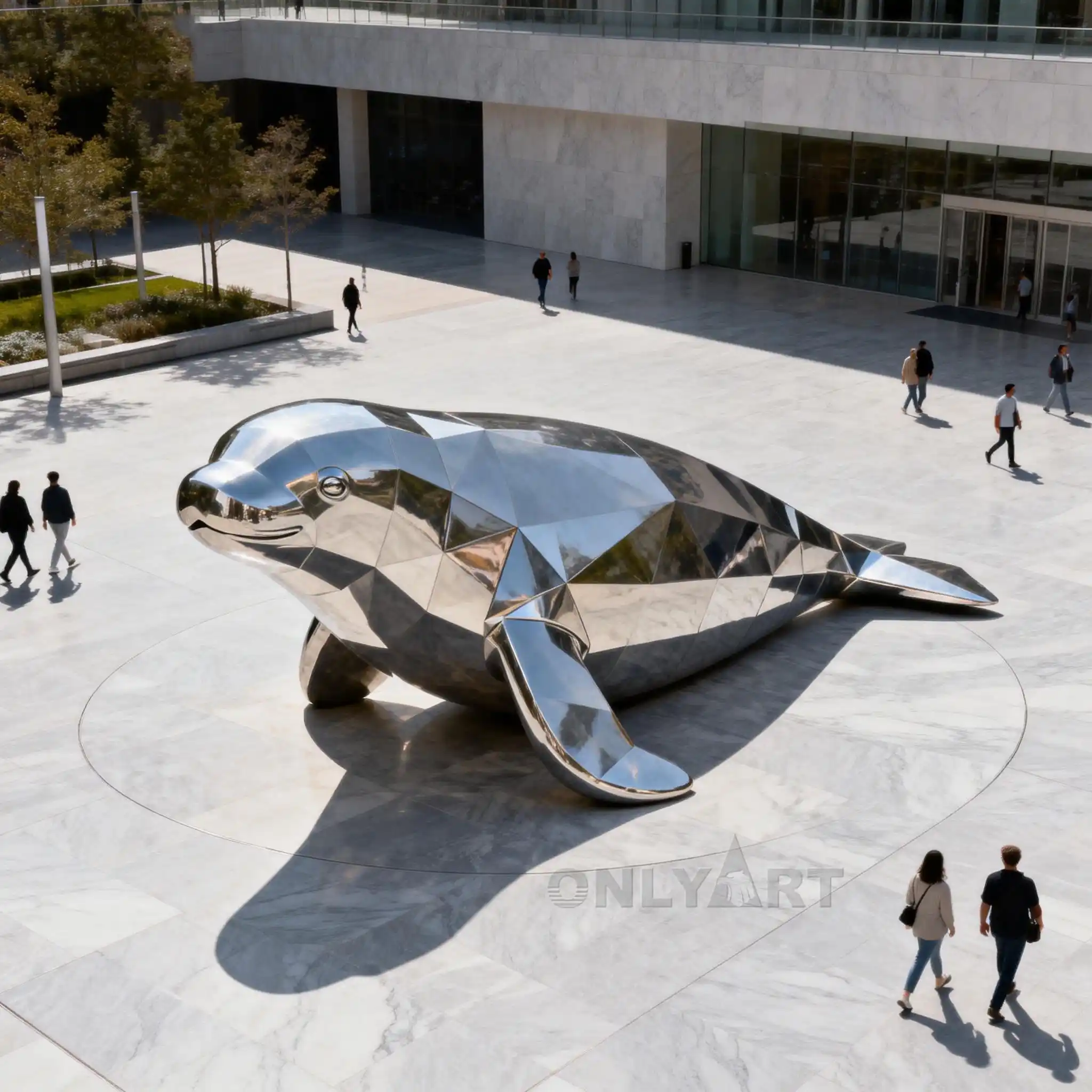 Our factory can customize stainless steel outdoor Abstract Geometric Manatee Sculpture in various sizes. This is a reclining large manatee sculpture with a geometric shape, perfect for outdoor plaza decoration, combining abstract art design.