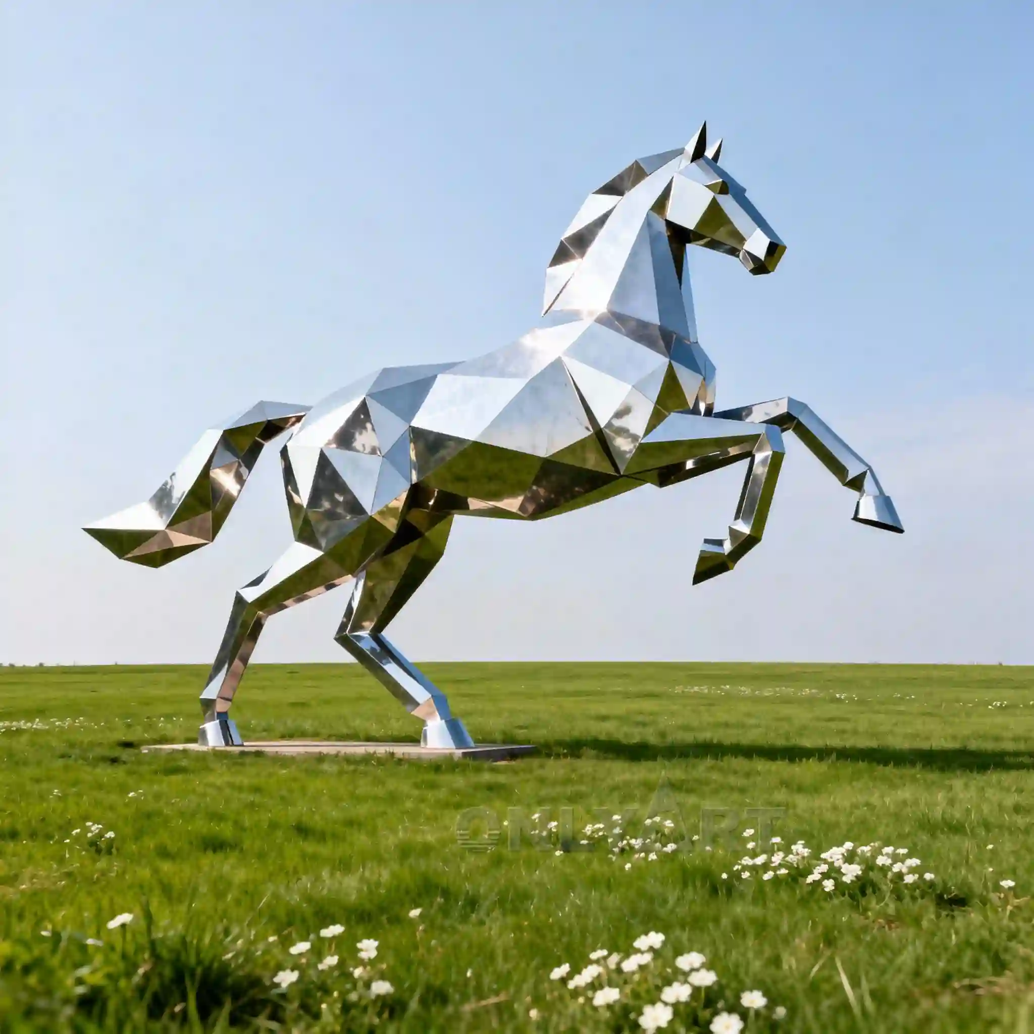 This is a stainless steel Art Standing Large Horse Sculpture. It features a geometric shape, a tall and imposing stature, a stainless steel metallic surface.