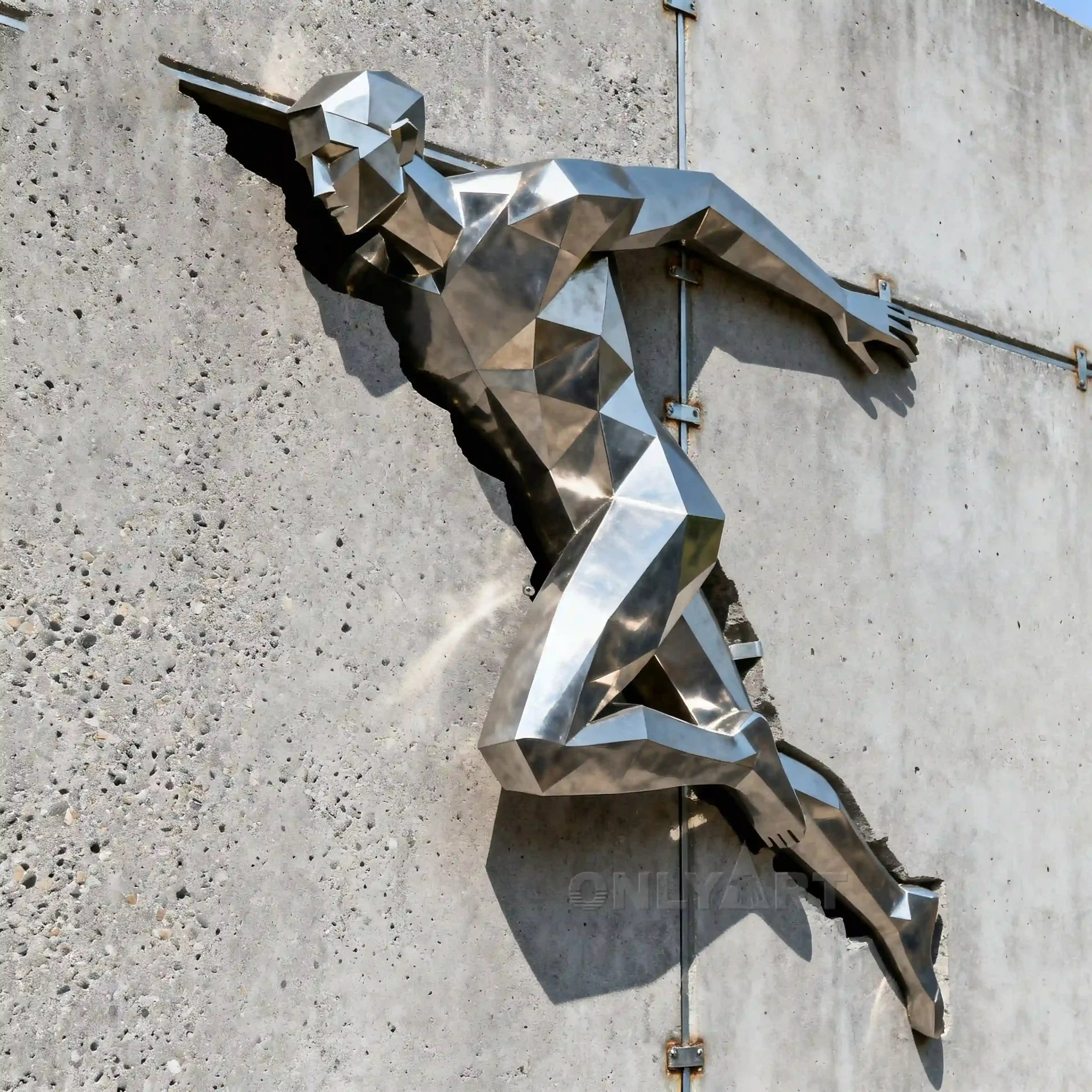 This is an abstract geometric 3D sculpture – the Dynamic Human Form Emerging Wall Out Man Decor Sculpture – forged from high-quality 2.5mm thick 304 stainless steel with a mirror-like finish. Of course, we can customize other colors for you, such as red, yellow, white, blue, etc.