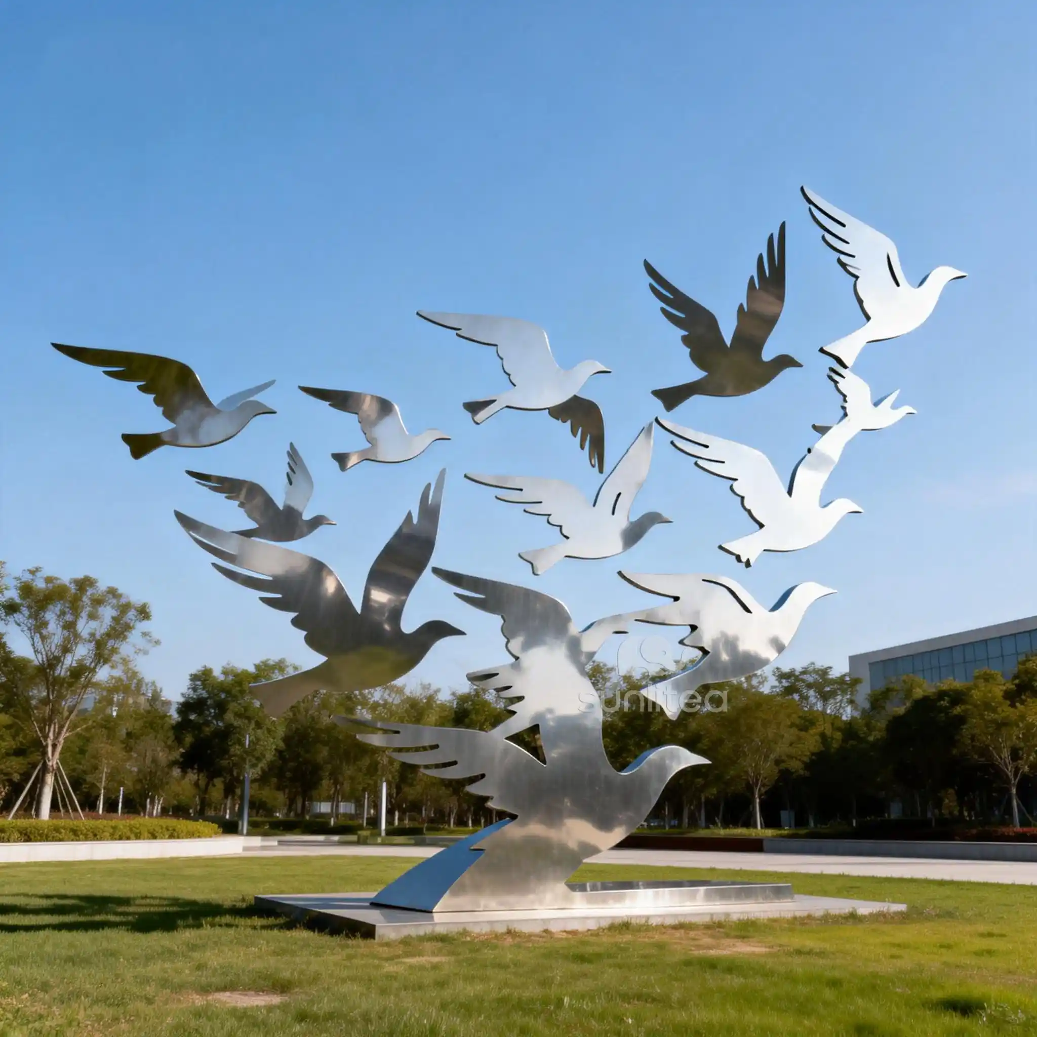 The Flock of Birds Sculpture Metal Art Statue is a dynamic, whimsical piece that adds movement to any garden. Standing at 6 feet wide.