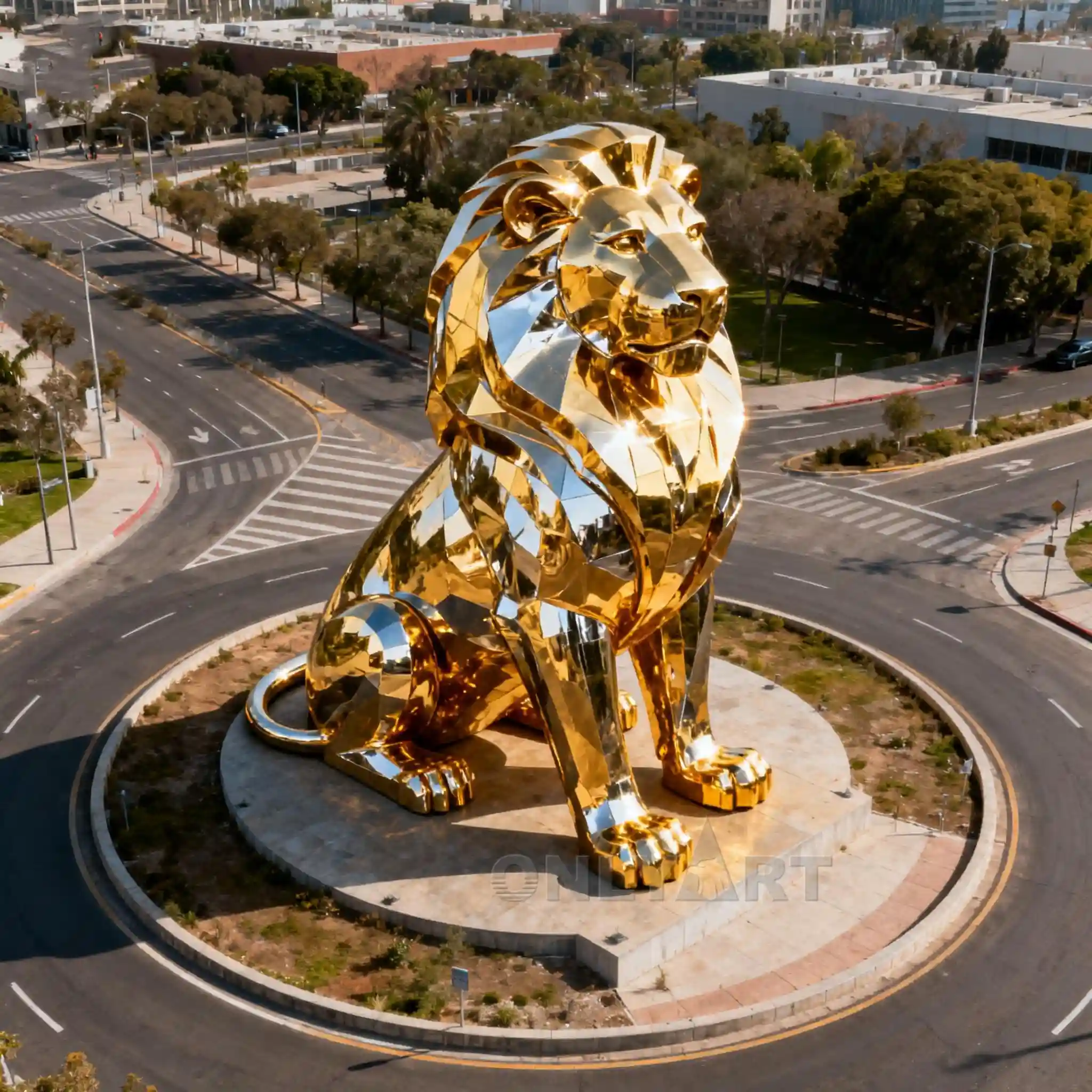This custom designed stainless steel large Gold Art Deco Lion Sculpture is intended to decorate an outdoor intersection. The lion sits majestically, its entire body gleaming gold, its gaze solemn and dignified. We can customize the size, color, materials, etc., to suit your needs. We are a leading Chinese sculpture factory, and our greatest advantage is the high quality of our sculptures.