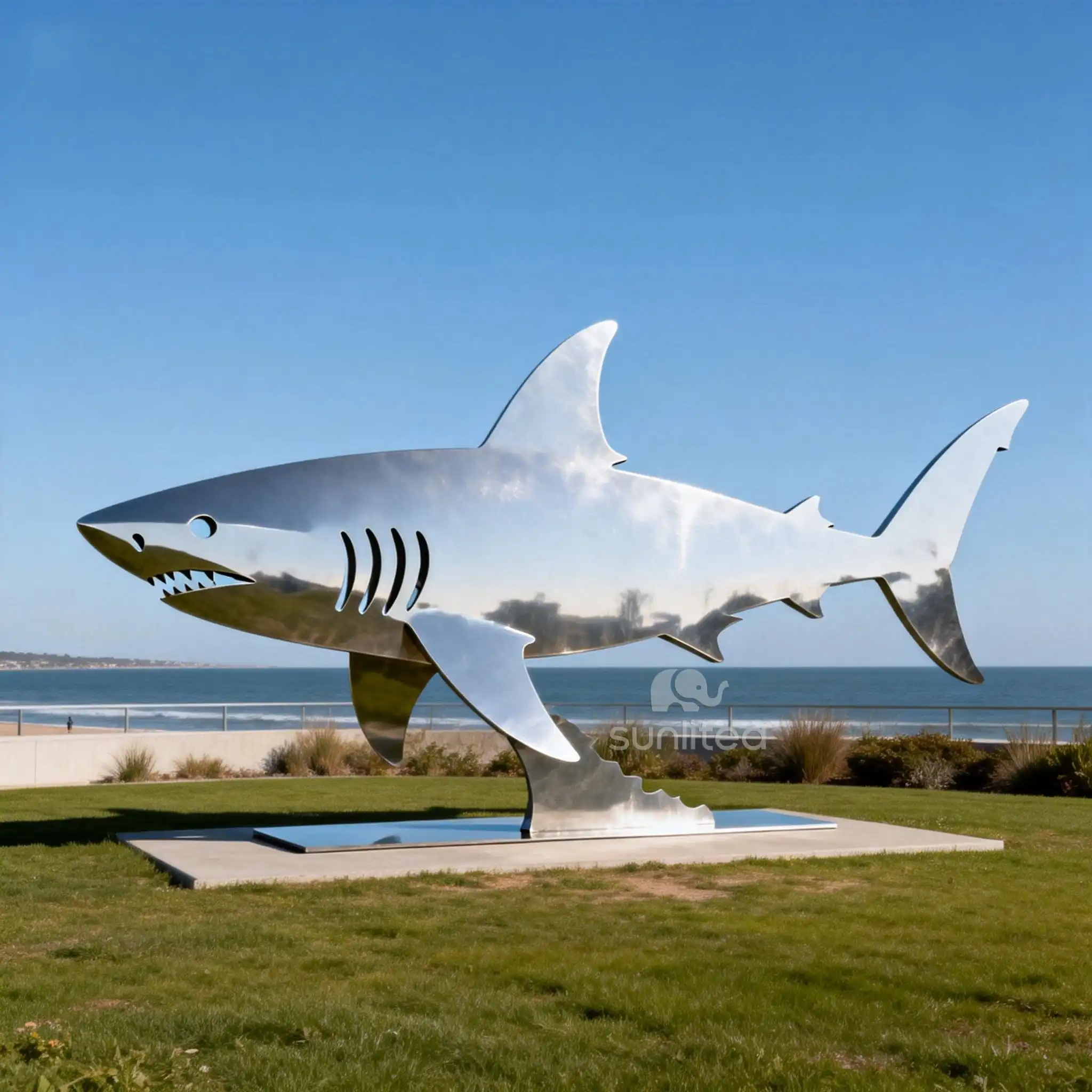 This large metal shark silhouette sculpture is a powerful piece that embodies the strength and grace of the shark. The shark??s form is captured in a bold, detailed silhouette, with its body streamlined and fins clearly defined, creating a sense of movement and power. Made from heavy-duty metal, it is designed to withstand outdoor conditions, making it perfect for coastal gardens, poolside areas, or beachfront homes. The sculpture??s large size makes it a focal point, drawing attention and inspiring awe. The shark is a symbol of power, strength, and survival, adding a layer of meaning to the sculpture. Whether placed in a residential garden or a public space, it serves as a reminder of the beauty and power of the ocean.