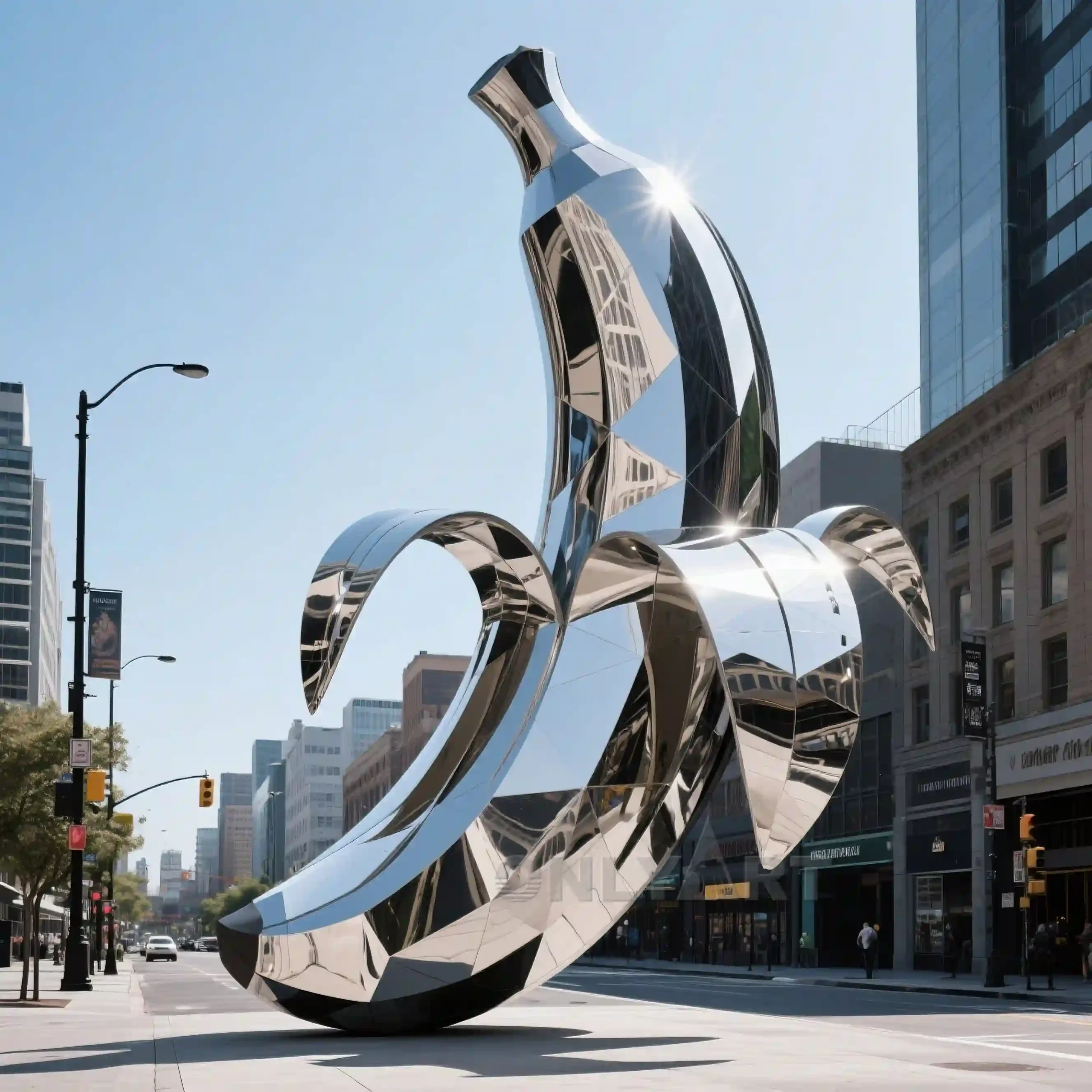 The Metal Banana Statue for Sale features a shaved metal banana sculpture. We can customize its size, such as 10ft or 20ft. We also offer custom finishes, including mirrored, brushed, painted, and electroplated finishes.