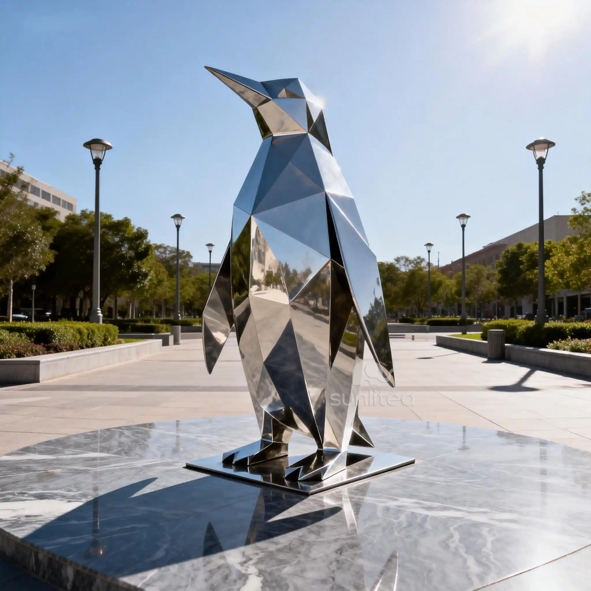 This Metal Big Penguin Statue is a bold statement piece, standing 100 inches tall and crafted from heavy-gauge steel with a mirror finish, bold statement piece for gardens, parks, and commercial landscapes.