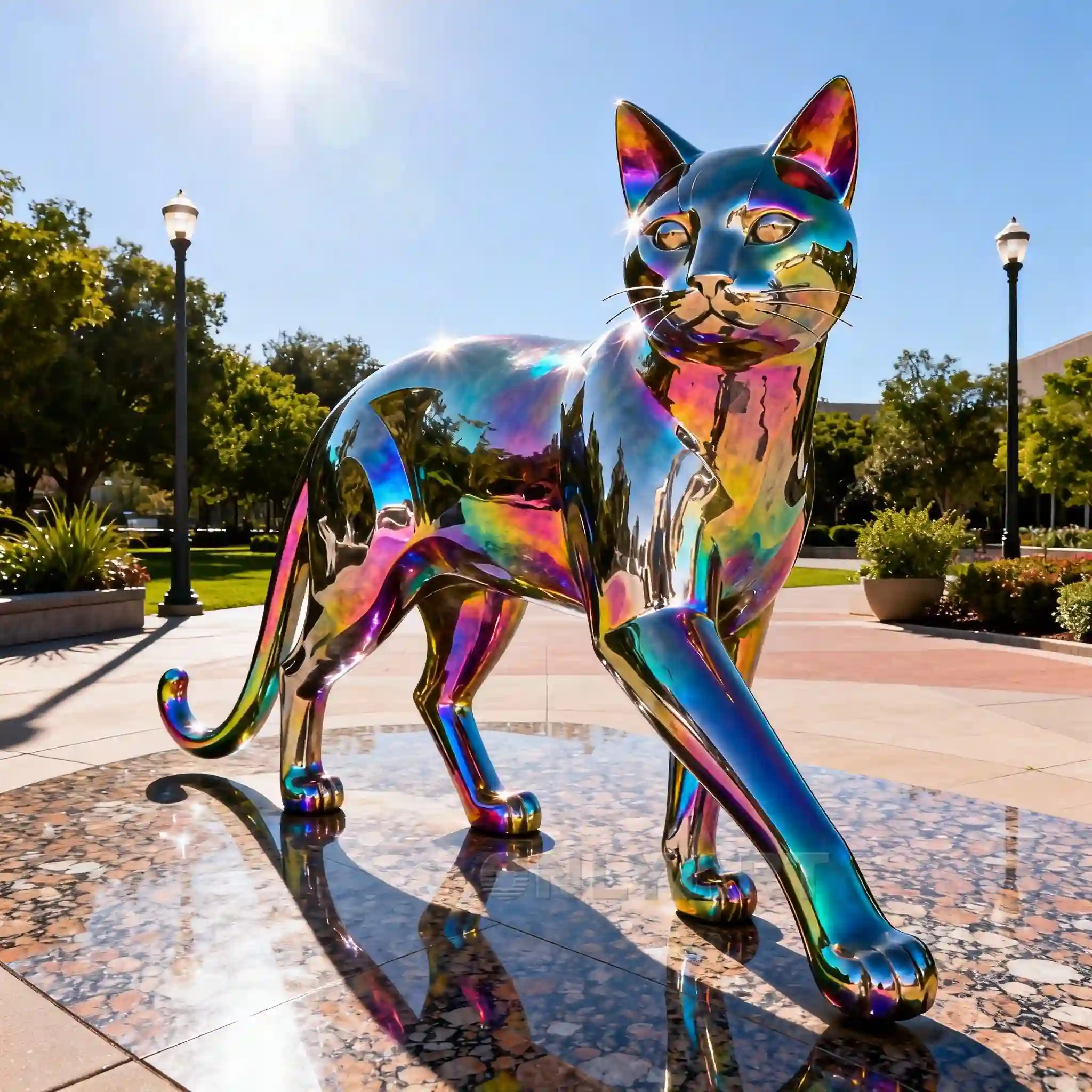This is a Stainless Steel Metal Colorful Rainbow Cat Sculpture for Gardens. Its body is multicolored and vibrant, made of stainless steel. Designed and crafted by artists in our factory, we can customize the size, materials, and surface color; a wide variety of surface colors are available for customization.