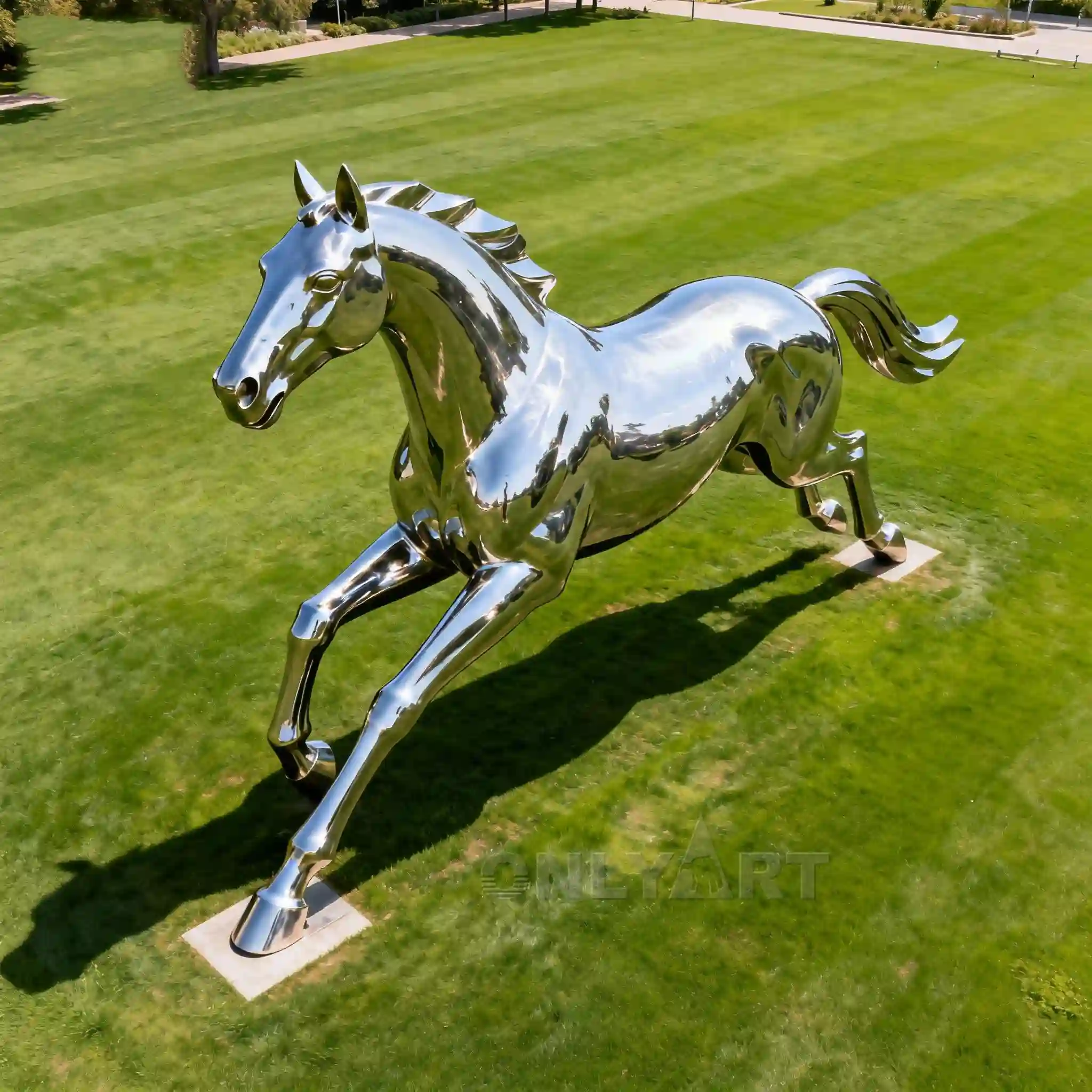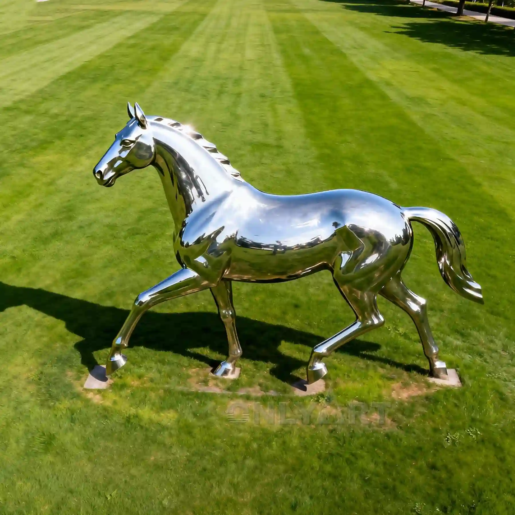 This is a majestic Metal Horse Yard Decor Sculpture, standing upright in the yard, gazing forward. It boasts a gleaming, mirror-finish stainless steel body.