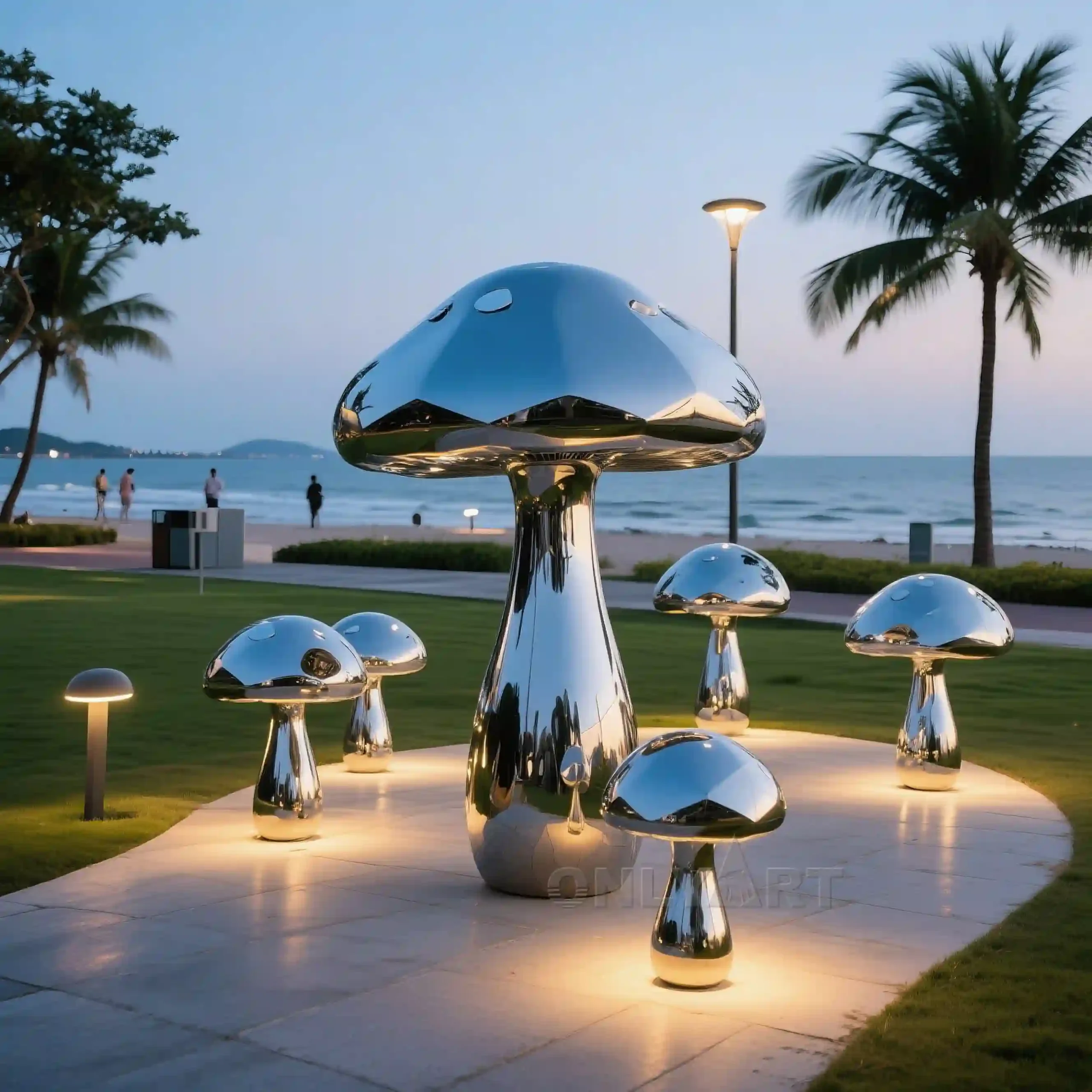 Design: When our artists designed this mushroom sculpture, they were thinking about unity. How can we achieve unity? So we designed the mushroom family sculptures you see today, featuring a wide variety of members, large and small. And why are they so colorful? We recognize that each mushroom is an independent individual, with its own thoughts, lives, and values. Therefore, our design not only distinguishes them by size, but also by color. This is the underlying principle behind our mushroom designs.