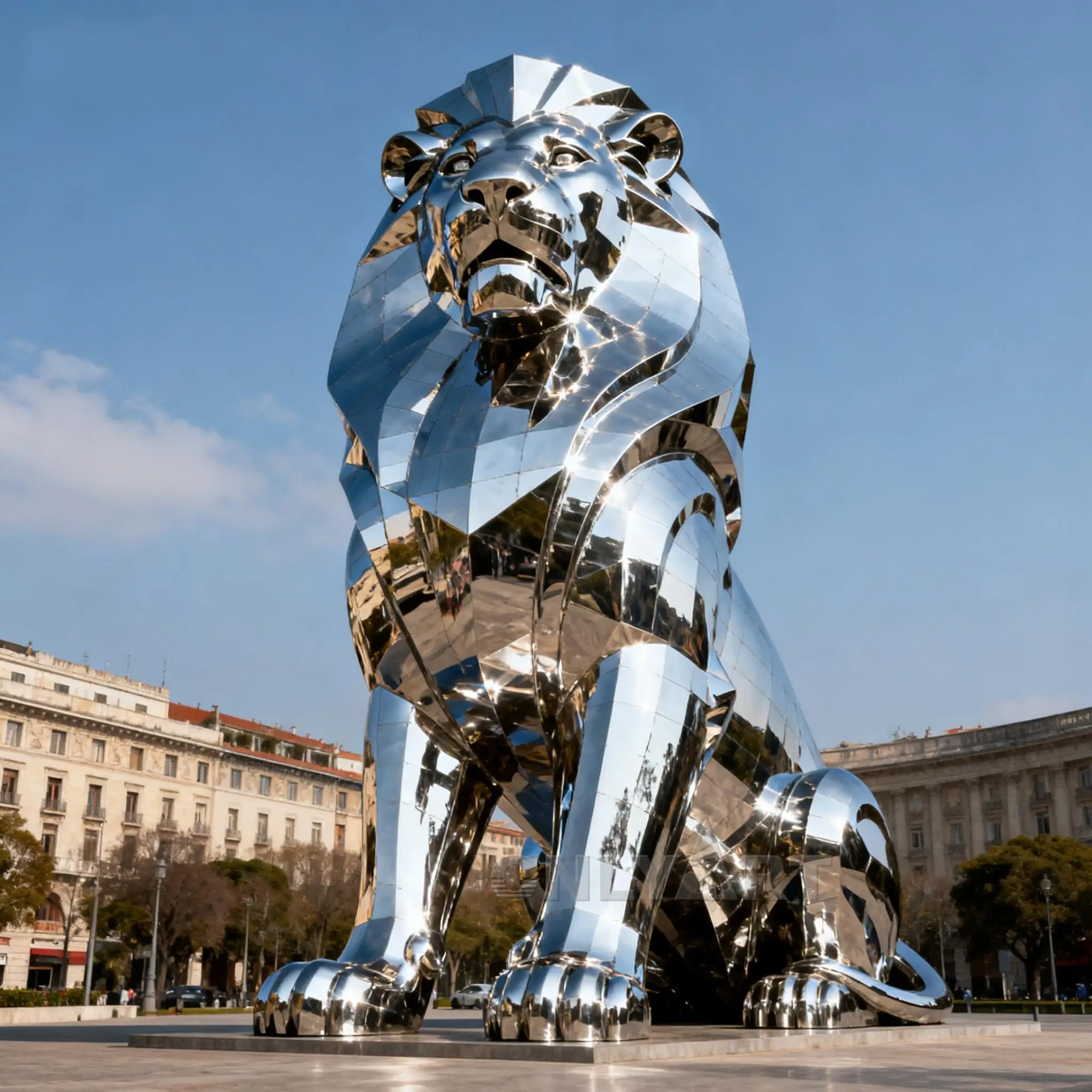 Stainless steel Outdoor Large Roaring Lion Statue. It features a geometric stainless steel body with a 3D effect, making it a perfect outdoor decorative piece.