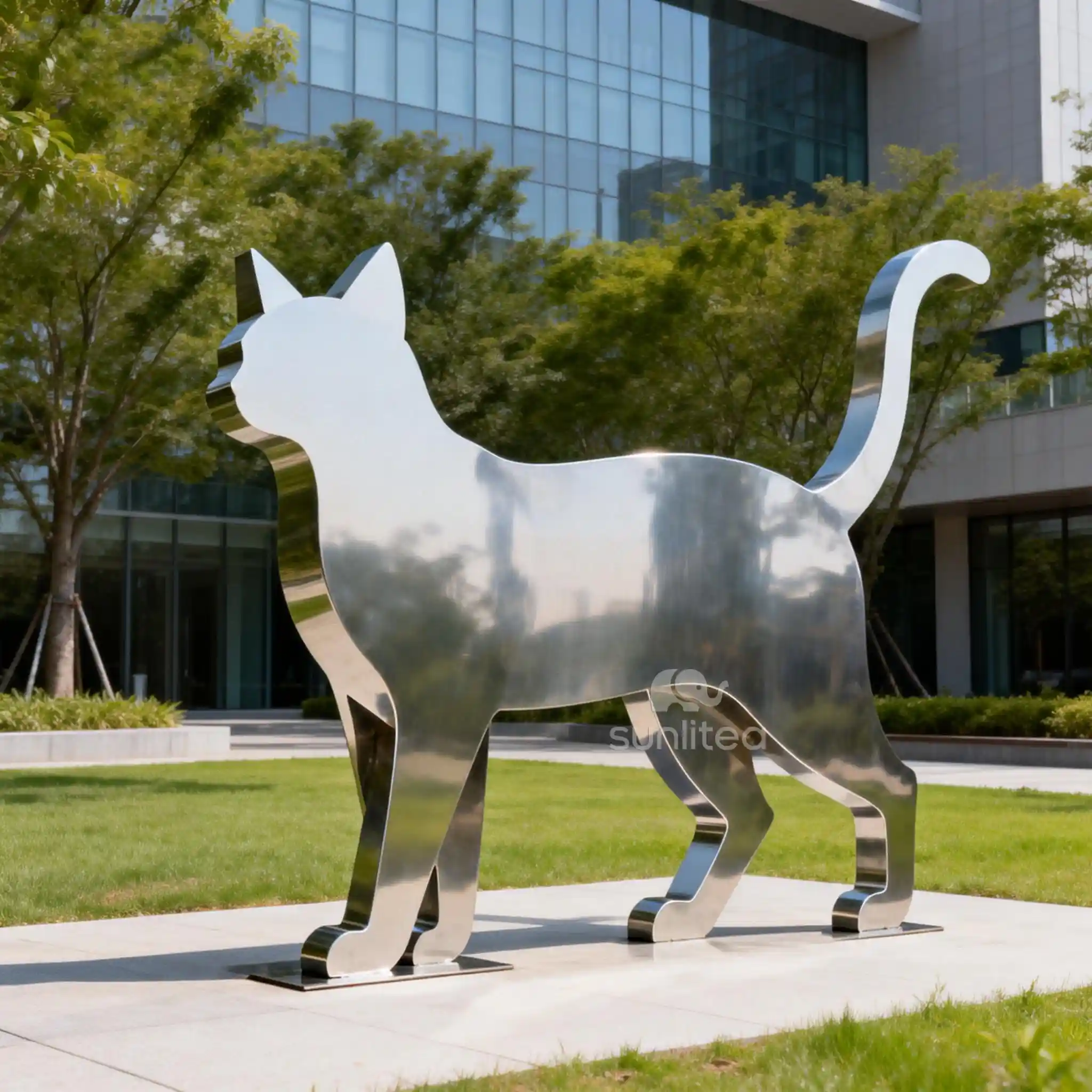 The Stainless Steel Metal Cat Silhouette Sculpture is a sleek, modern piece that adds a touch of feline charm to any space. Made from polished stainless steel, this 2-foot-tall sculpture features a reflective surface that mirrors its surroundings, creating a dynamic display that changes with the light. The cat??s silhouette is minimalist and elegant, with clean lines that emphasize its sleek body and curved tail. Unlike traditional cat decor, this piece is contemporary and sophisticated, making it ideal for modern gardens, urban balconies, or indoor spaces. The stainless steel construction ensures it??s rust-free and low-maintenance, while its compact size makes it easy to place. Whether placed on a windowsill, in a flower bed, or on a patio, it adds a touch of elegance to any space. It??s not just a sculpture; it??s a work of art that celebrates the cat??s grace in a fresh, modern way.