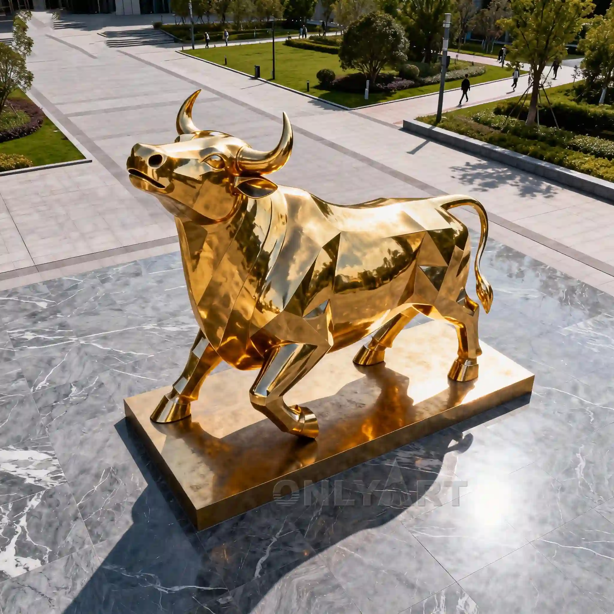 This outdoor plaza decoration features a Stainless Steel Large Bull Sculpture with a mirror-finish finish, a massive size, large horns, and strong limbs.